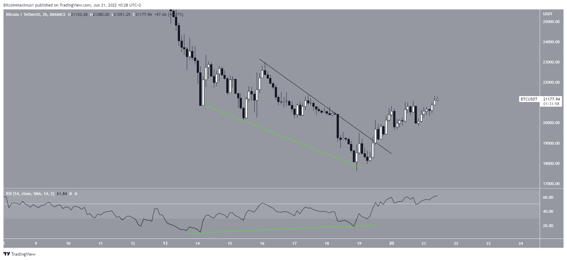 Por fim, o gráfico de duas horas mostra que o preço do Bitcoin já rompeu uma linha de tendência de baixa que estava em vigor desde a última quarta-feira (15).