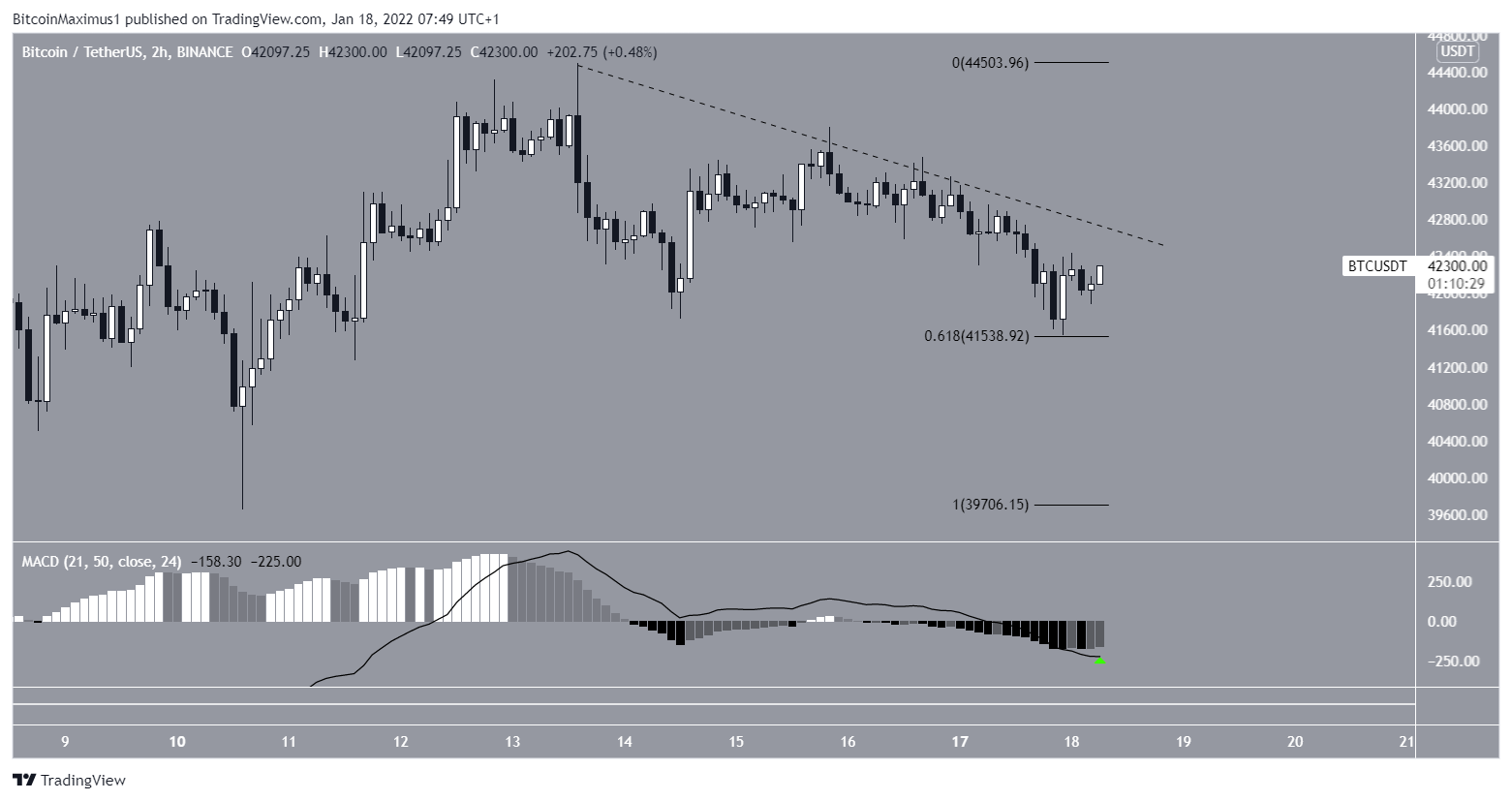 O gráfico de duas horas está mostrando alguns sinais de alta, mas não o suficiente para confirmar uma reversão de tendência. Em primeiro lugar, o Bitcoin voltou a subir após atingir o nível de retração de 0,618 de Fibonacci em US$ 41.538. Este é um nível comum para o fim de períodos corretivos de preço.