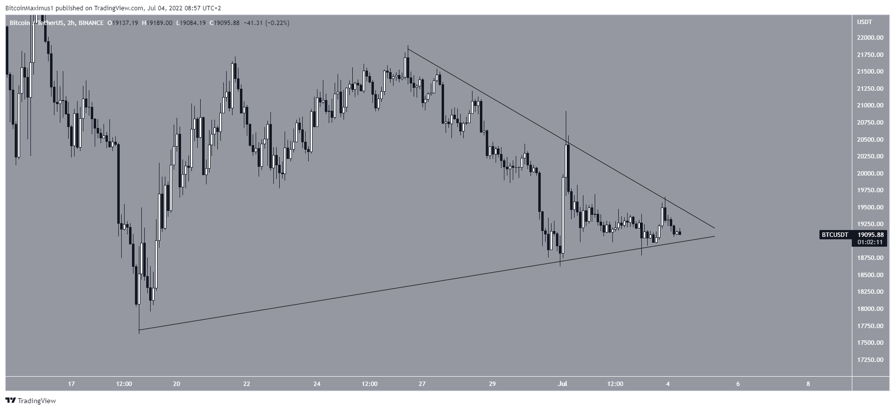 Finalmente, o gráfico de duas horas mostra que o preço do Bitcoin está dentro de um triângulo simétrico desde a mínima de junho. Embora esse triângulo seja considerado um padrão neutro, espera-se que ele leve a um rompimento abaixo dele devido ao fato de estar vindo após um movimento de queda.