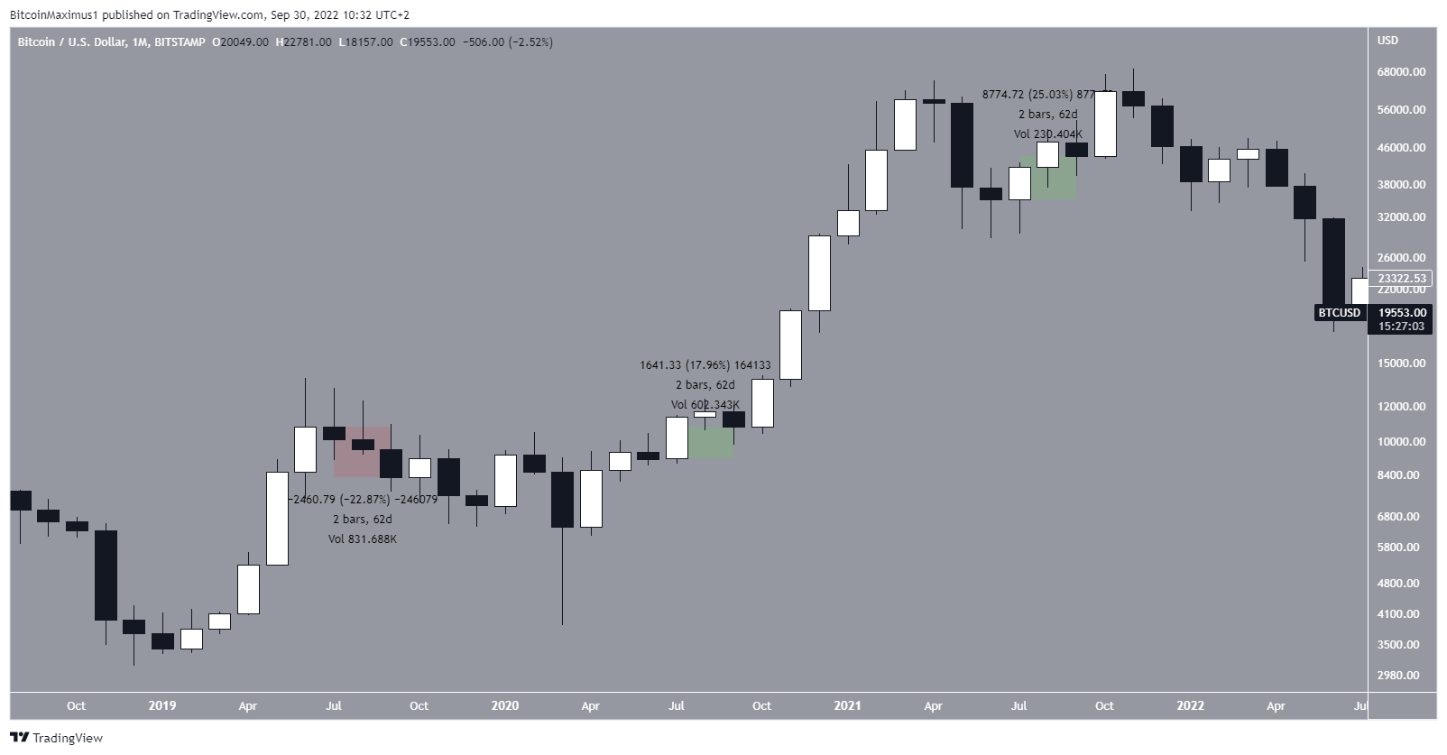 Para continuar a tendência, o Bitcoin apresentou um desempenho misto no terceiro trimestre de cada ano entre 2018-2021. Seu preço caiu 23% em 2019, subiu 18% em 2020 e 25% em 2021.
