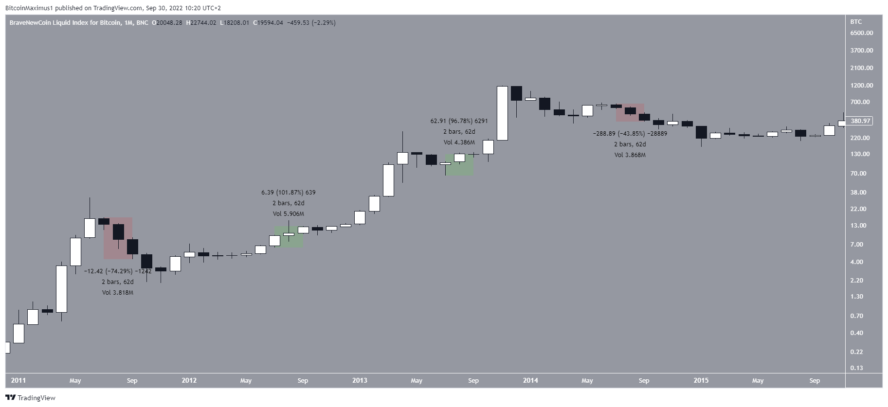 O desempenho do BTC em cada Q3 entre 2011 e 2014 foi diferente. Em 2011, o preço caiu 74,29%. Como a máxima histórica foi alcançado em junho, o movimento de queda começou no mês seguinte e foi extremamente acentuado.