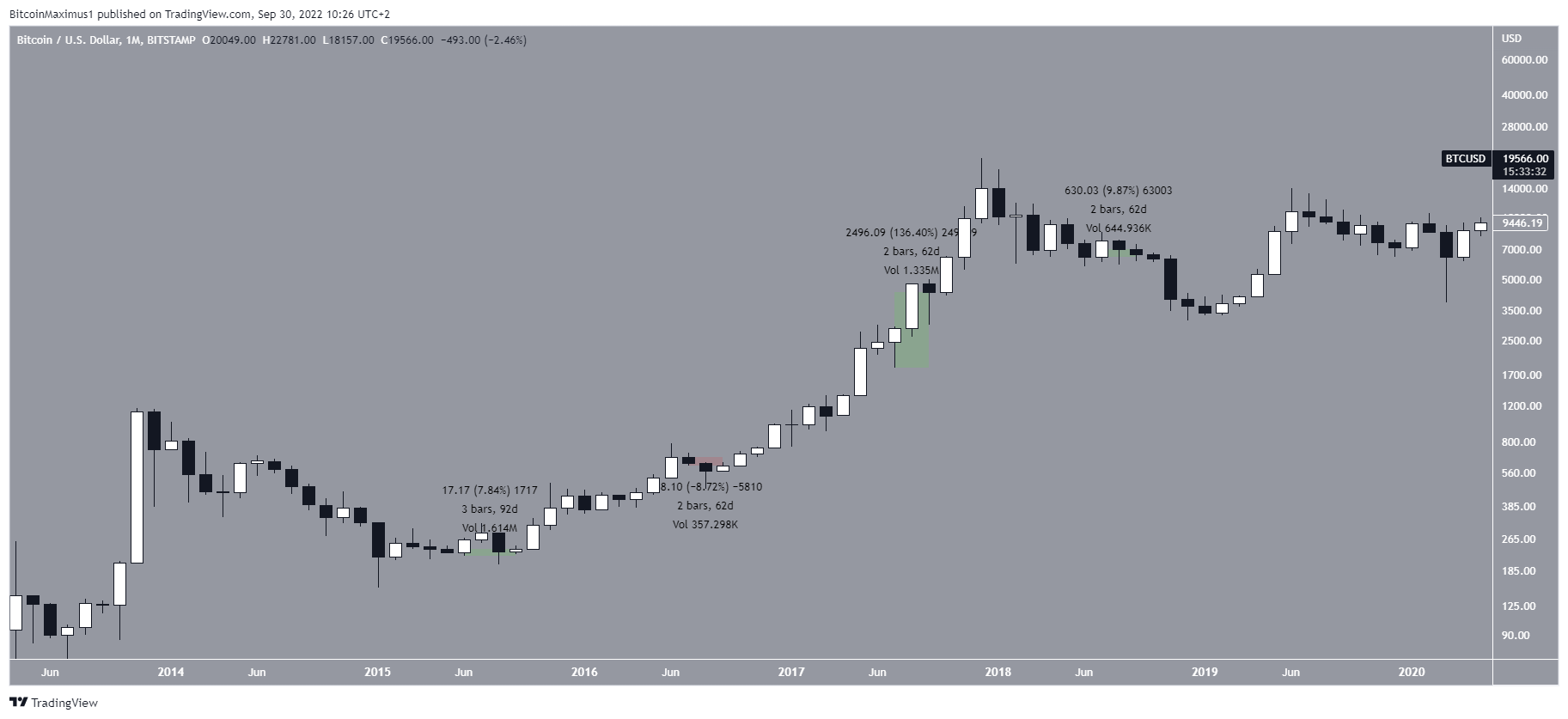 Depois, o BTC começou sua recuperação em 2012 e 2013 e subiu quase 100% a cada vez. Finalmente, a próxima alta histórica foi alcançada em novembro de 2013, então o preço estava em tendência de queda no terceiro trimestre de 2014, caindo 43,85% no processo.