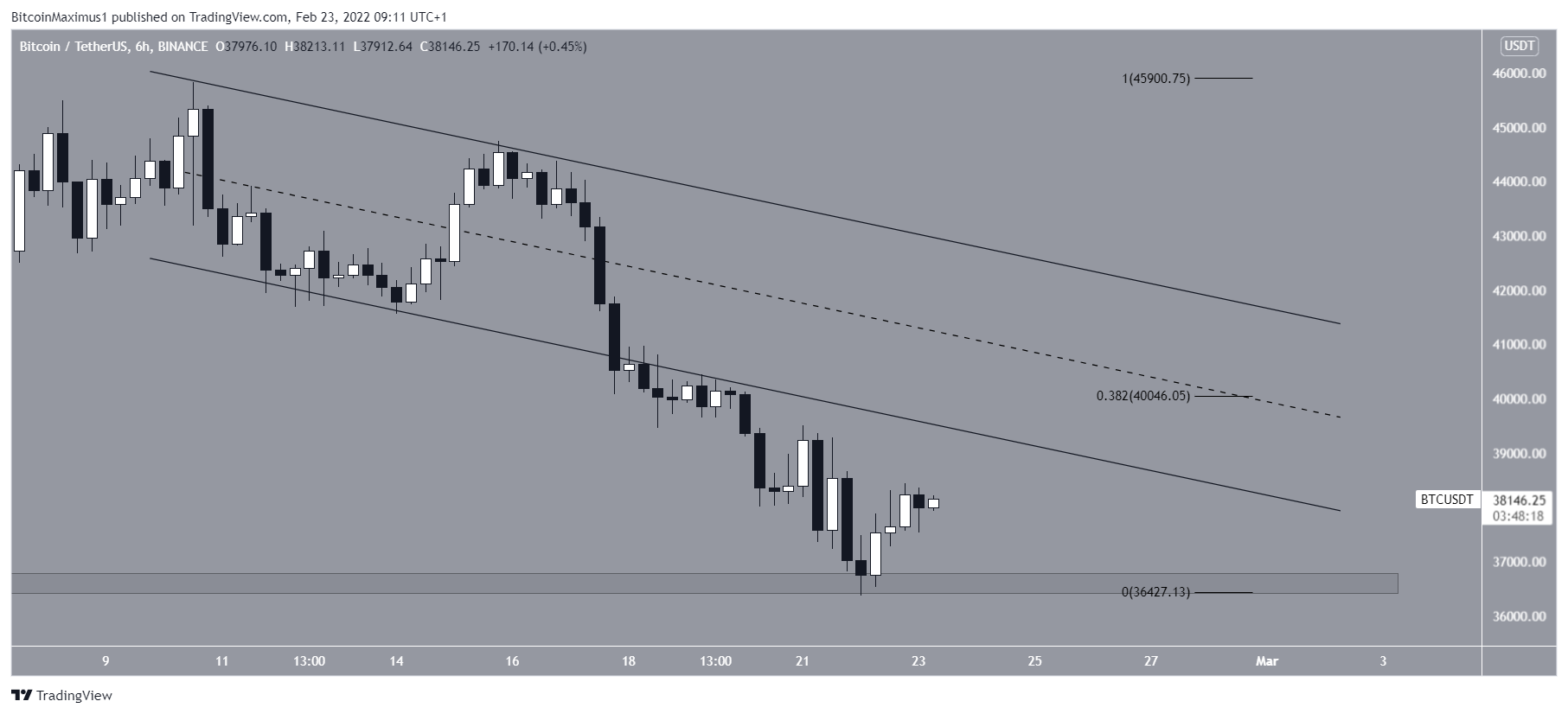O gráfico de seis horas mostra que a principal área de resistência está localizada em US$ 40.050, criada pelo nível de retração de 0,382 de Fibonacci. Além disso, a resistência corresponde à linha média de um canal paralelo de baixa, a partir do qual o Bitcoin rompeu em 15 de fevereiro.