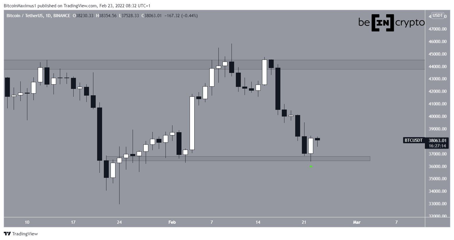 O Bitcoin subiu consideravelmente nesta quarta-feira (23), saltando na área de suporte horizontal de US$ 36.600 (ícone verde). A área atua como suporte desde o início do movimento de alta em 24 de janeiro.