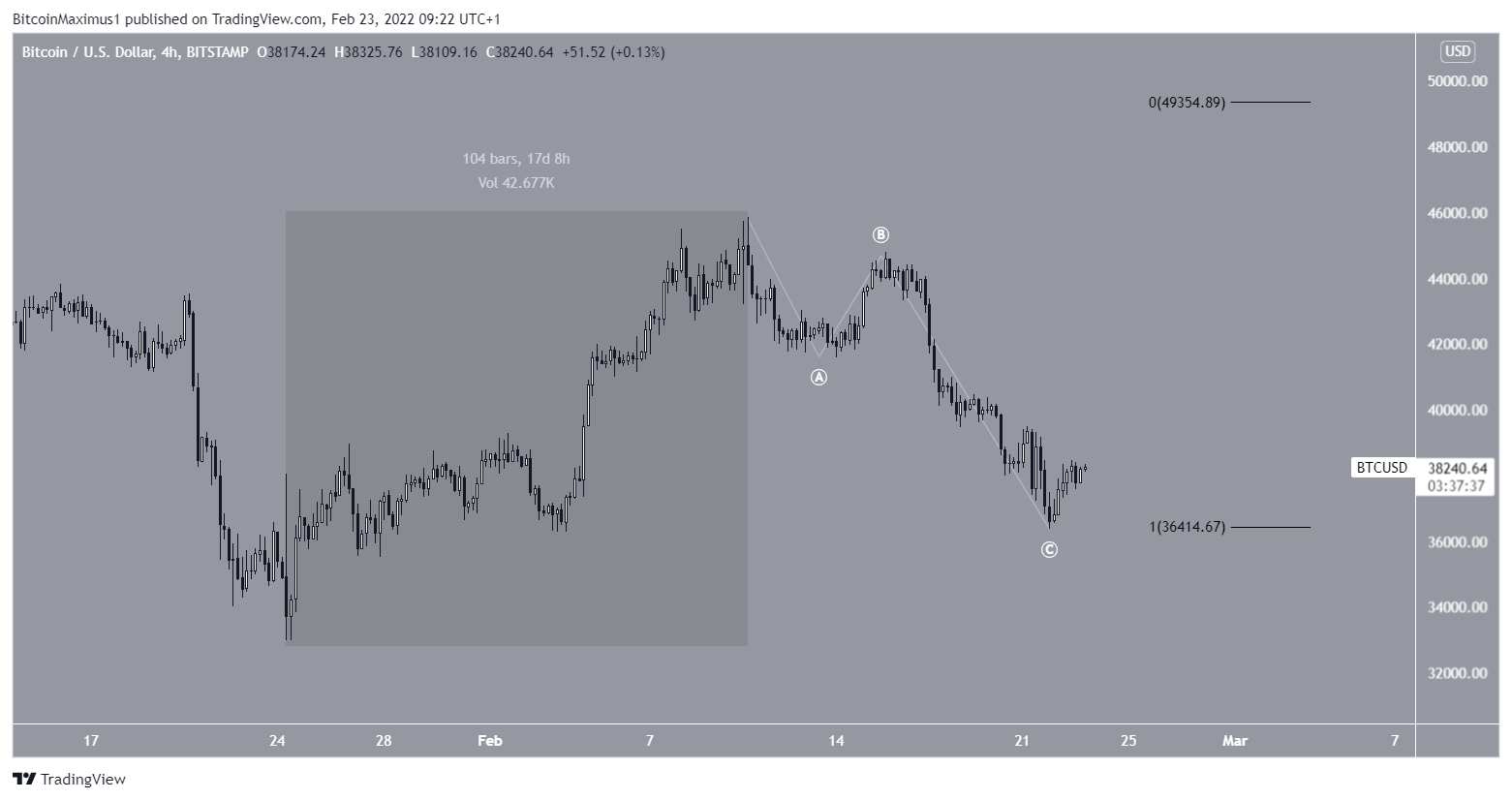 O primeiro cenário sugere que o BTC concluiu uma estrutura corretiva A-B-C. Portanto, seria esperado um movimento de alta para US$ 49.350. Essa faixa de preço é encontrada projetando a altura da alta anterior.