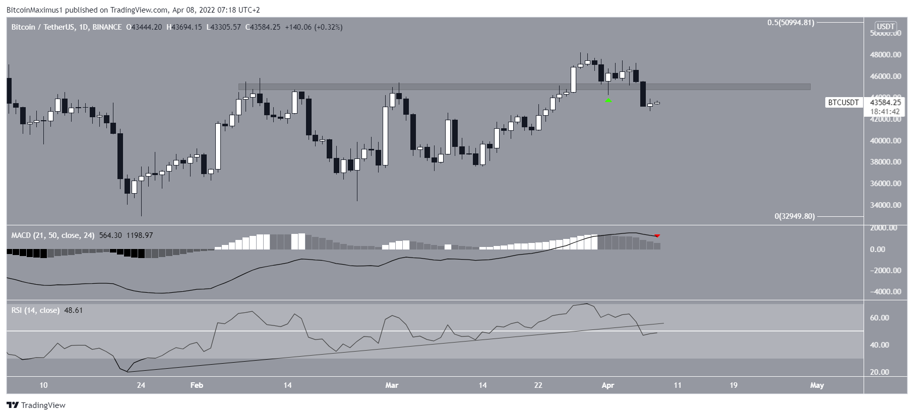 O gráfico diário fornece uma perspectiva mais de baixa. O Bitcoin vem caindo desde que atingiu um topo em US$ 48.189 no dia 28 de março. Inicialmente, ele saltou na área horizontal de US$ 44.800 em 1º de abril (ícone verde). Isso aparentemente validou a área como suporte.