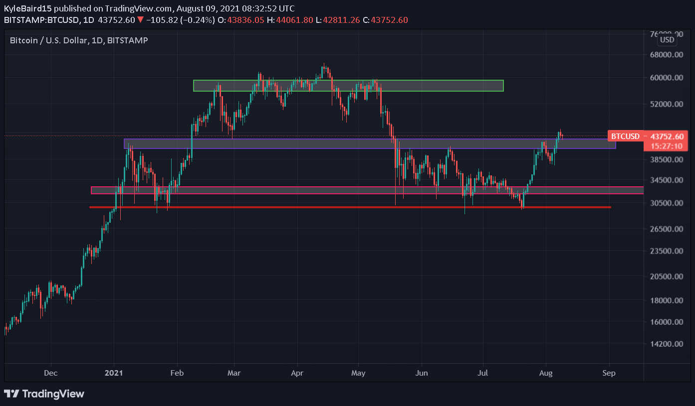 O BTC, no entanto, pode primeiro cair para a zona de US$ 41.000 para criar uma mínima mais alta e validar uma reversão de resistência para suporte antes de voltar desafiar níveis de resistência mais altos.