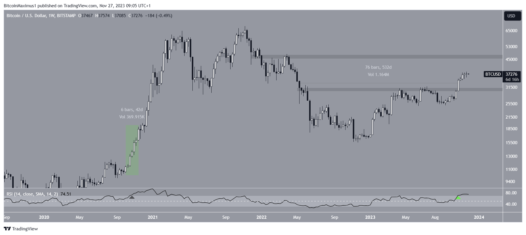 Um desenvolvimento interessante é que o ativo criou seis candles semanais sucessivas de alta. A última vez que isso aconteceu foi em outubro de 2020 (destaque), quando se iniciava o ciclo de alta anterior.
