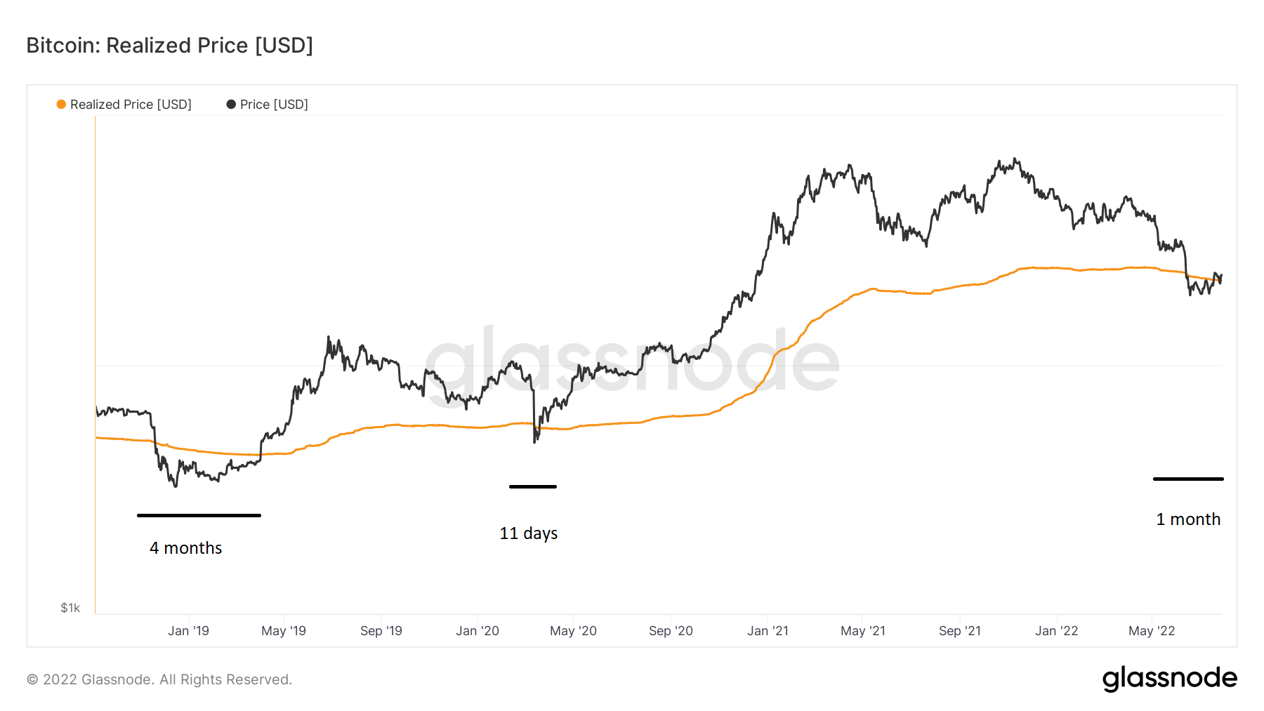 Portanto, não há consenso sobre o tempo em que ocorre o desvio abaixo do preço realizado. No entanto, uma conclusão interessante é que, uma vez que o preço do BTC consiga recuperar o preço realizado, ele não cairá abaixo dele novamente. Então, isso significaria que o ativo já atingiu um fundo de preço.