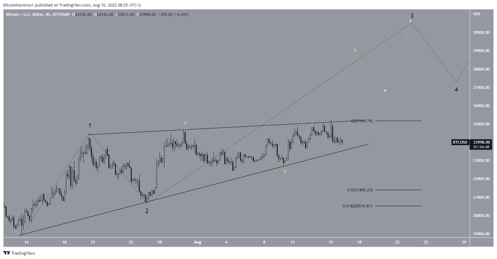 Se for verdade, isso criaria uma formação de onda 1-2/1-2, que pode ajudar a acelerar um impulso em um futuro próximo. Para que a contagem permaneça correta, o Bitcoin precisa se manter acima da inclinação do 1-2 original e romper acima de sua linha de tendência de alta (preto).