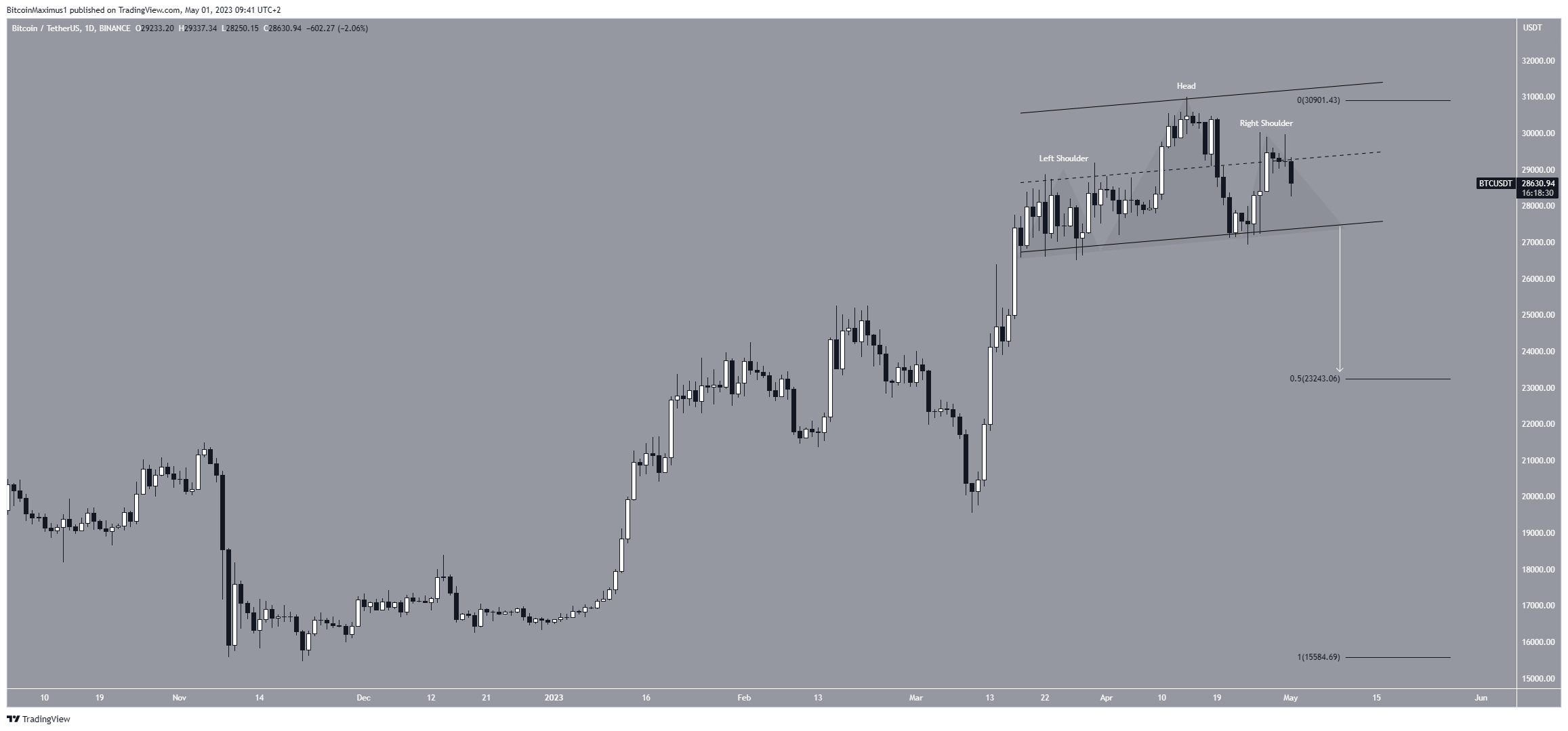 Se isso ocorrer, também causará um rompimento do canal. Um movimento que percorre toda a altura do padrão levará o preço do BTC a US$ 23.400, também coincidindo com o nível de retração de 0,5 de Fibonacci (preto).