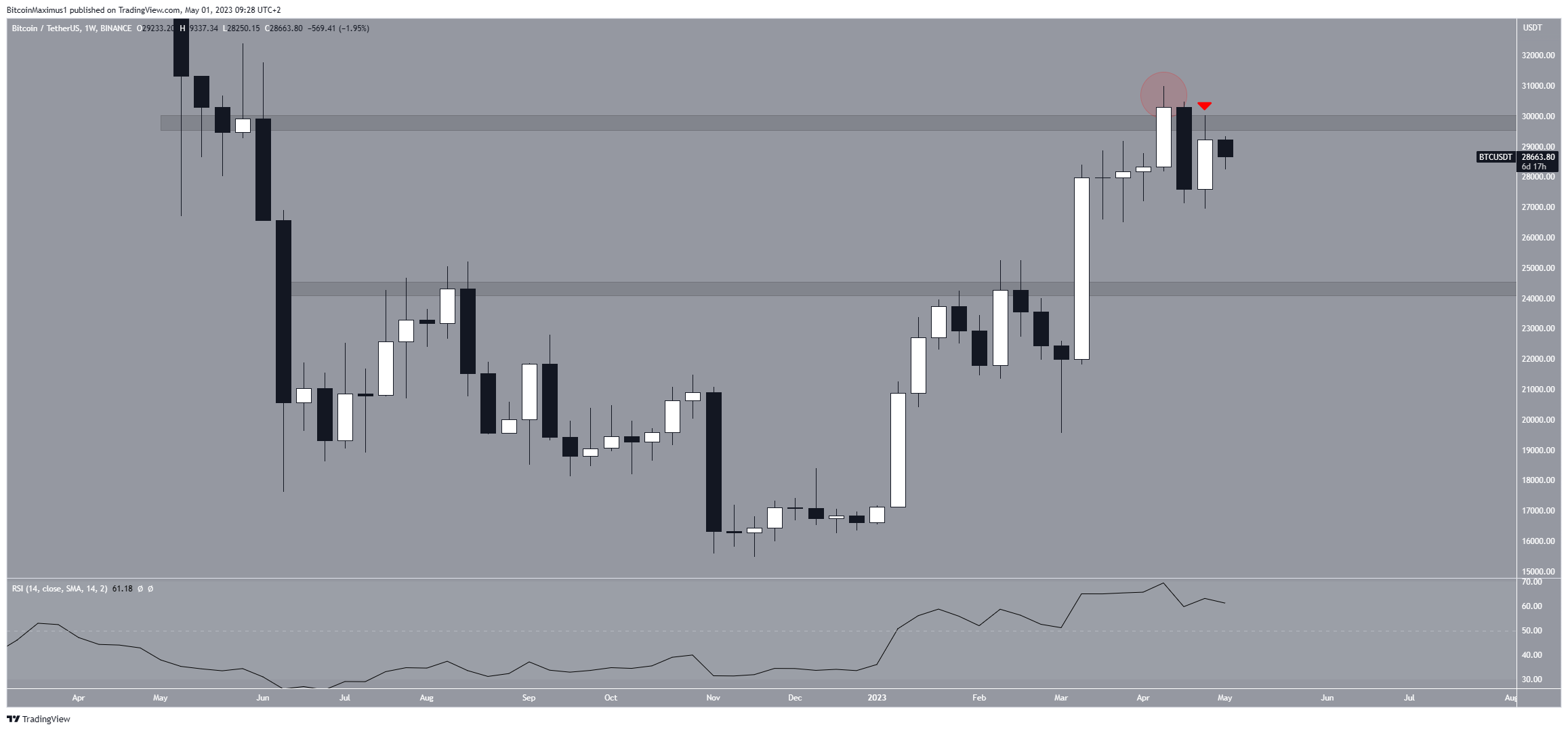 Na semana passada, o preço tentou subir, mas foi rejeitado pela área de resistência de US$ 29.800. Assim, em um período de duas semanas, o BTC desviou acima de uma importante área de resistência (círculo vermelho). Em seguida, validou-a como resistência (ícone vermelho). Ambos são considerados sinais de baixa e muitas vezes levam a movimentos de queda.