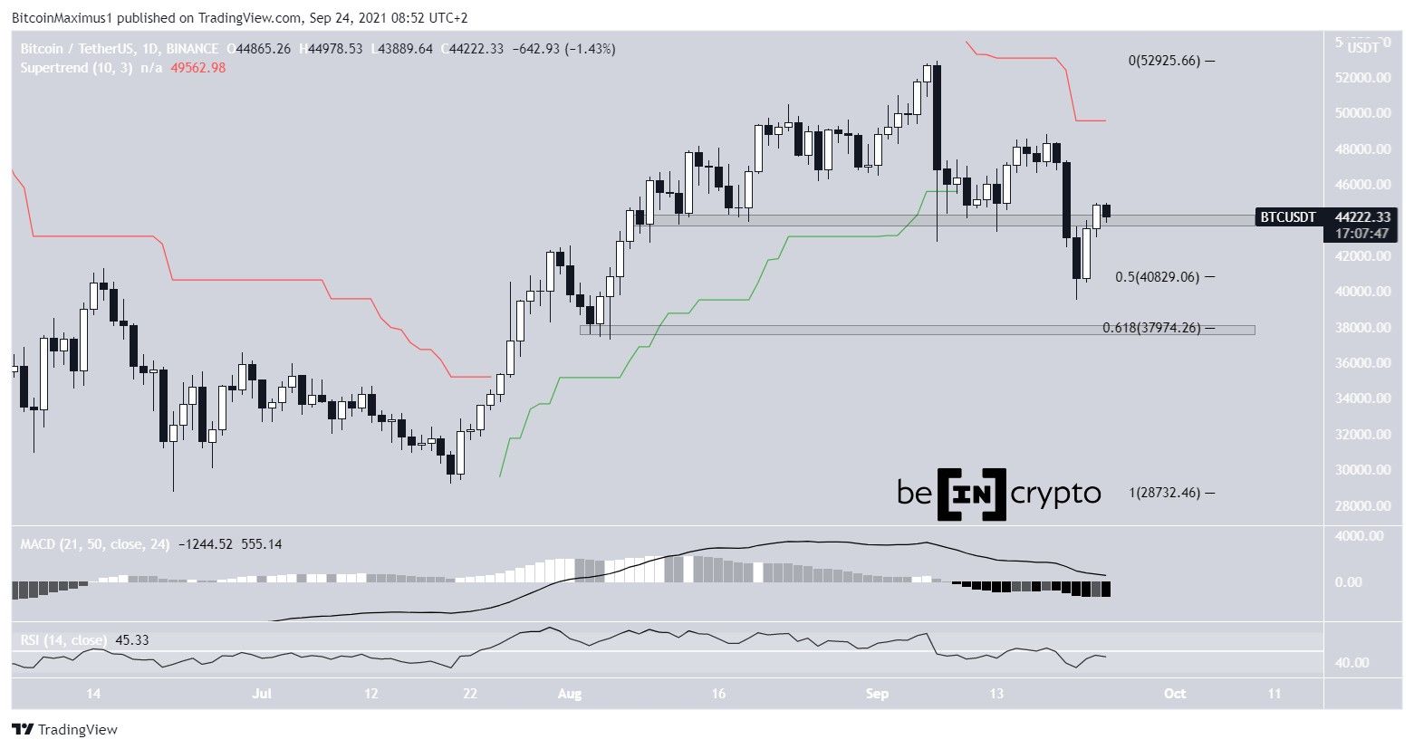 Os indicadores técnicos no gráfico diário ainda são de baixa. O RSI está abaixo de 50, o MACD está caindo (embora tenha criado uma barra de momentum superior) e o Supertrend é de baixa. Se outra queda acontecer, o próximo suporte seria encontrado em US$ 38.000.