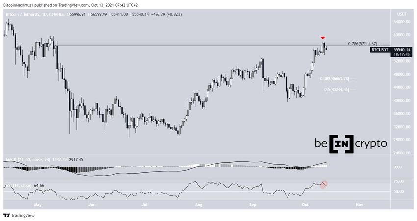 Na última terça-feira, o Bitcoin atingiu um topo em US$ 57.839, superando a área de resistência de US$ 57.200. No entanto, ele não conseguiu se manter nesse nível (ícone vermelho) e caiu consideravelmente. A queda é um sinal de que o preço não foi capaz de romper a área de resistência de US$ 57.200. Esta é a resistência final para uma nova máxima histórica de preço.