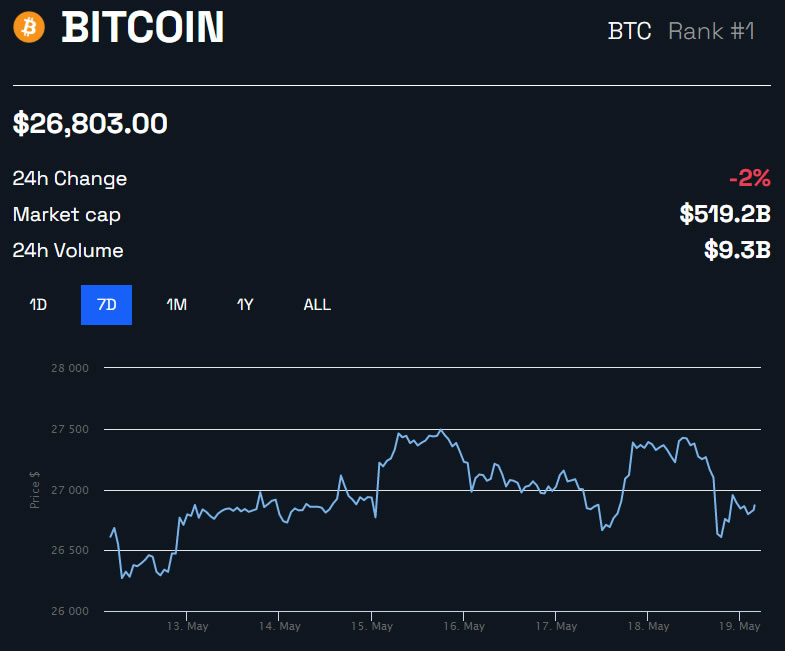 O Bitcoin opera com queda de 2% no dia, caindo para US$ 26.800 no fechamento da matéria. O ativo vem se consolidando nas últimas semanas após atingir uma máxima anual de US$ 31.000.
