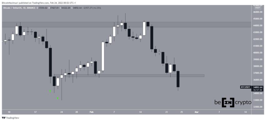 O gráfico de seis horas mostra que o Bitcoin está pairando logo acima da área de suporte horizontal de US$ 34.500. Anteriormente, o ativo desviou abaixo desse nível em 24 de janeiro antes de recuperar a linha.