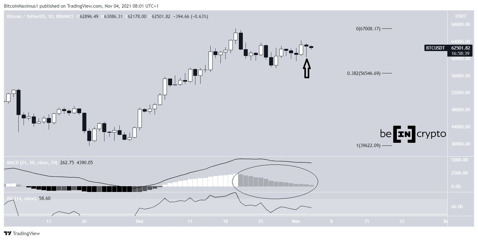 Desde então, o BTC segue uma linha de tendência de alta (tracejada). O salto de quarta-feira coincidiu com esta linha de suporte (ícone verde) e o nível de retração de 0,618 de Fibonacci em US$ 61.270 (preto).