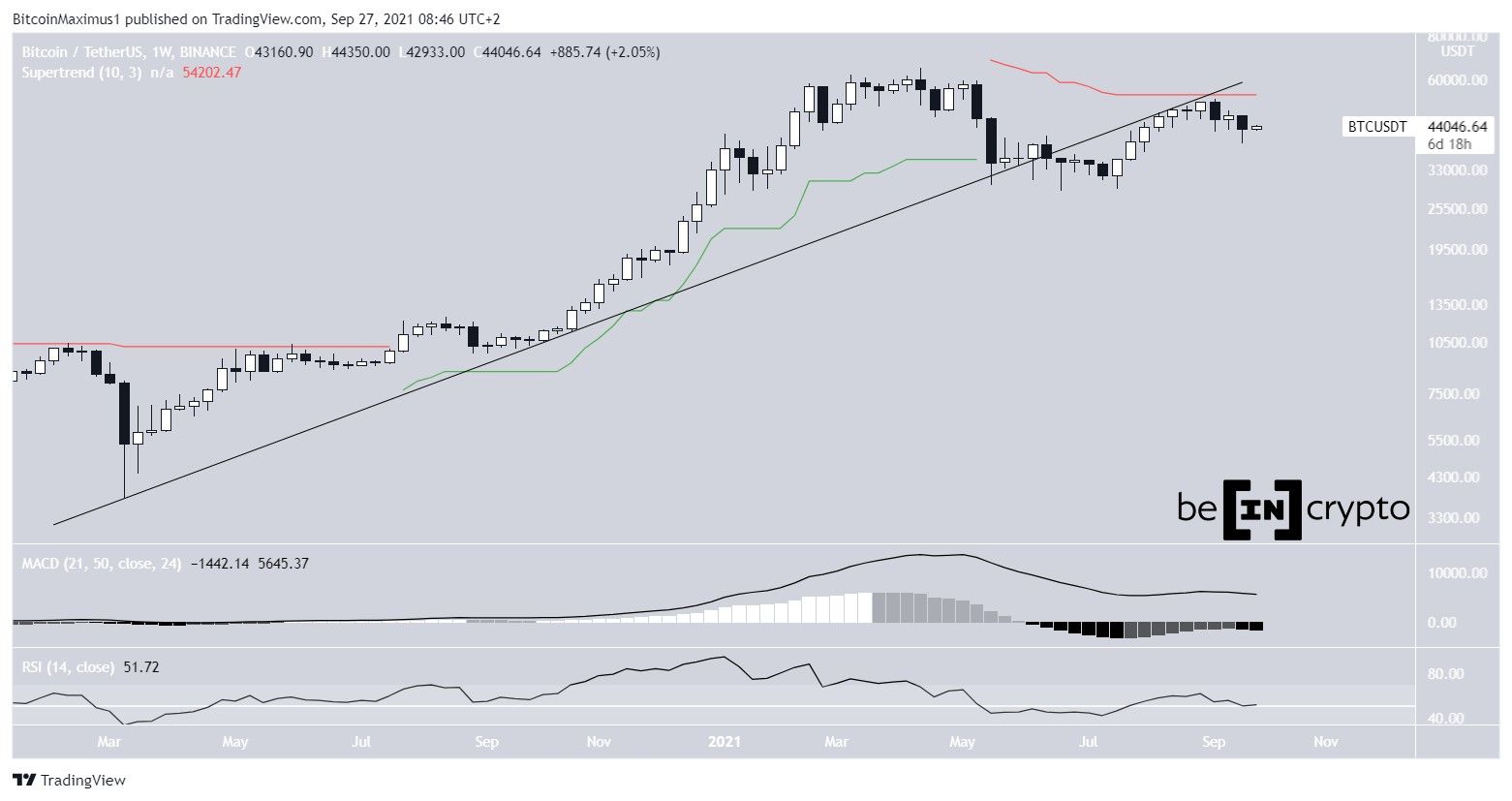 O BTC está em queda desde o rompimento de uma linha de tendência de baixa, que foi validada como resistência de preço. O movimento também coincidiu com uma rejeição da linha de supertrend (linha vermelha), que é de baixa.