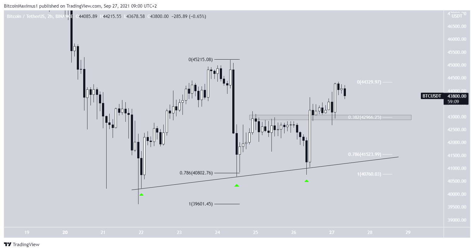 SponsoredO gráfico de duas horas mostra que o BTC voltou a crescer após atingir o nível de retração de 0,786 de Fibonacci e criou uma linha de tendência de alta. A linha foi validada várias vezes (ícones verdes) até agora. Enquanto ela estiver em vigor, a estrutura de alta permanece intacta.