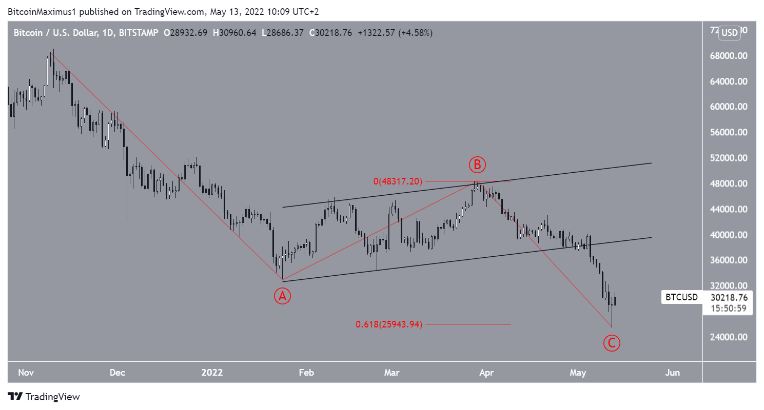 A contagem de ondas sugere que o Bitcoin está corrigindo dentro de uma estrutura corretiva A-B-C (vermelho) desde que atingiu o preço recorde de US$ 69.000 em novembro de 2021.