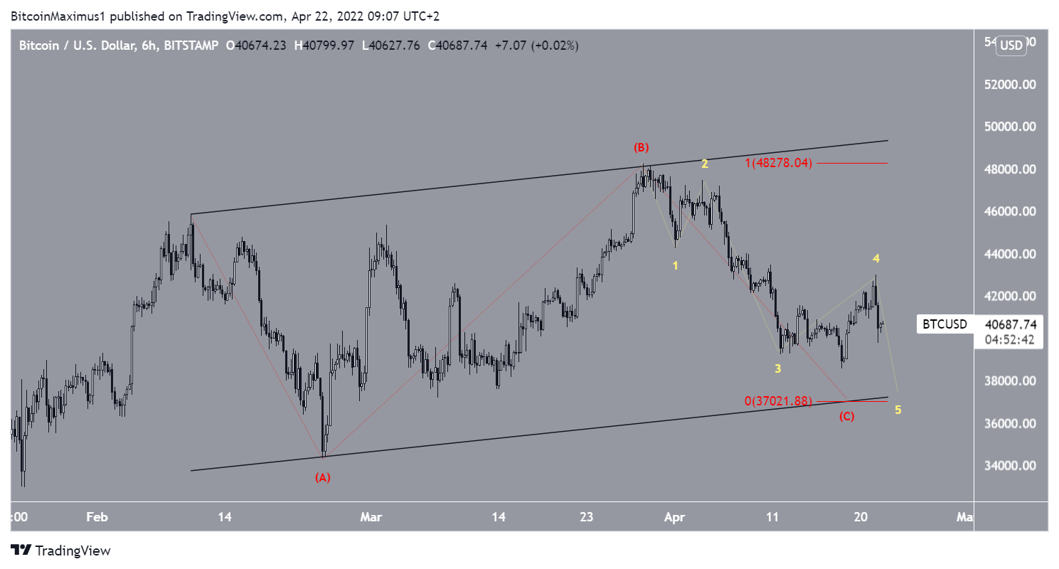 A contagem de ondas sugere que o Bitcoin está se movendo em um padrão corretivo A-B-C (vermelho) desde 10 de fevereiro. Se for verdade, o ativo parece estar atualmente na onda C. Dar às ondas A e C uma proporção de 1:1 levaria a uma mínima de US$ 37.000.