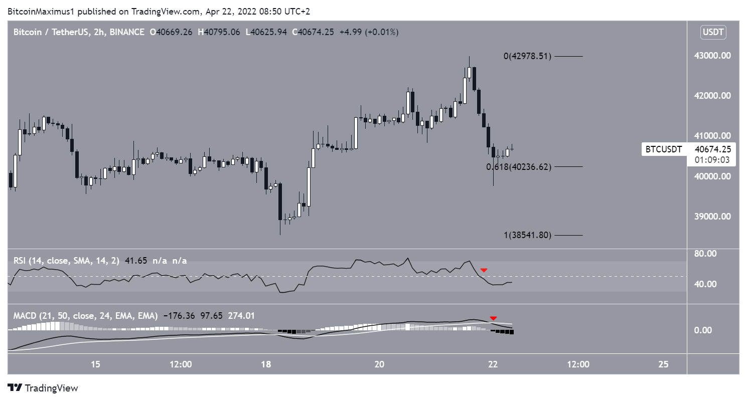 O gráfico de duas horas mostra que o BTC saltou no nível de retração de 0,618 de Fibonacci, em US$ 40.250. No entanto, o RSI e o MACD também estão em queda.