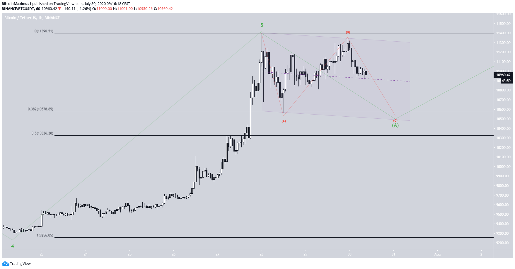No curto prazo, podemos ver que essa é uma correção plana A-B-C (vermelha), e o preço está atualmente na onda C. Se desenharmos um canal paralelo conectando as máximas recentes, obteremos uma mínima de US $ 10.500 para o fundo da C.