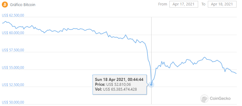A queda brusca ocorreu próximo à meia-noite e, uma hora depois, o preço já alcançava os US$ 52.800, segundo dados do agregador Coingecko.