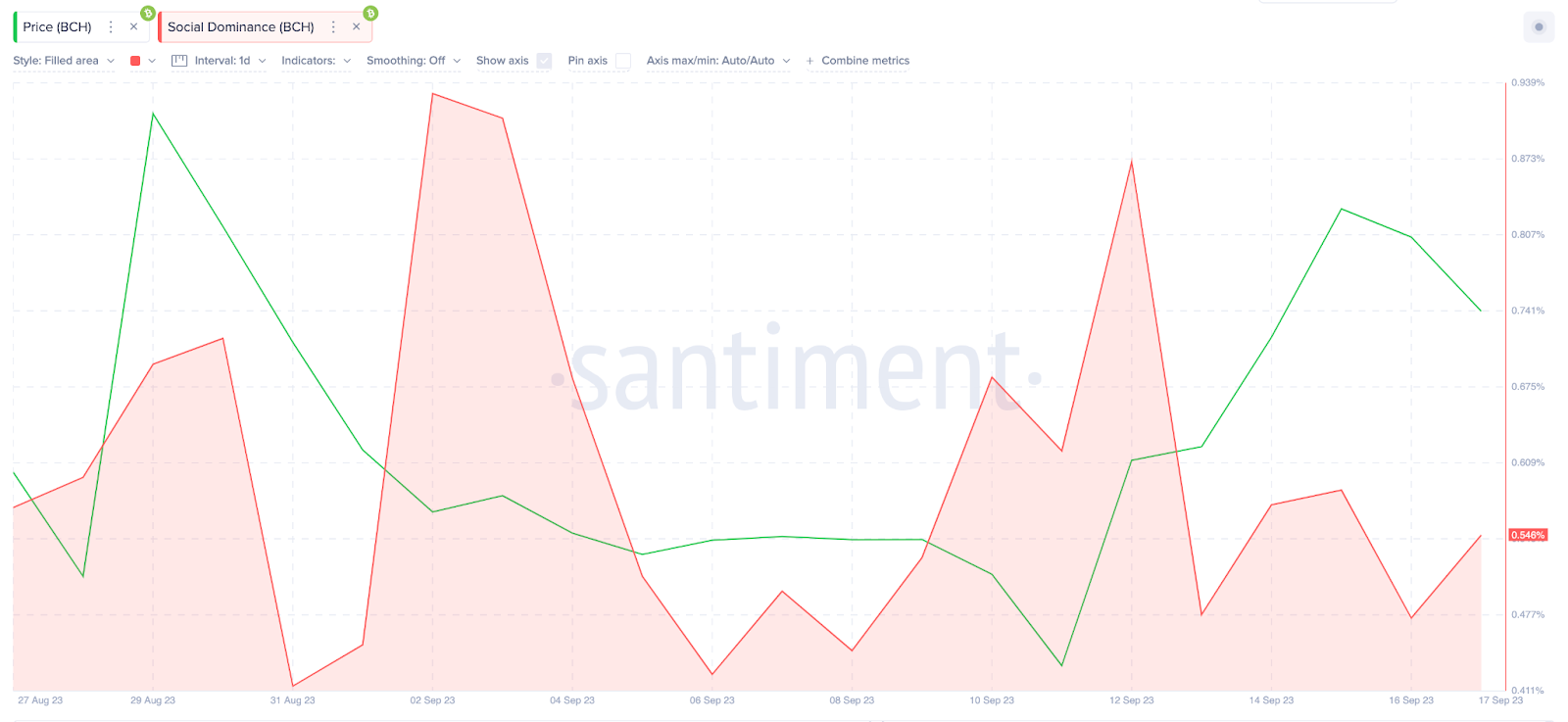 Apesar da recente valorização de preço, o Bitcoin Cash ainda está passando despercebido por muitos participantes do mercado de varejo. Conforme ilustrado abaixo, embora o ativo esteja em alta desde 11 de setembro, o Domínio Social apresentou tendência de queda de 0,87% em 12 de setembro para 0,55% em 18 de setembro.
