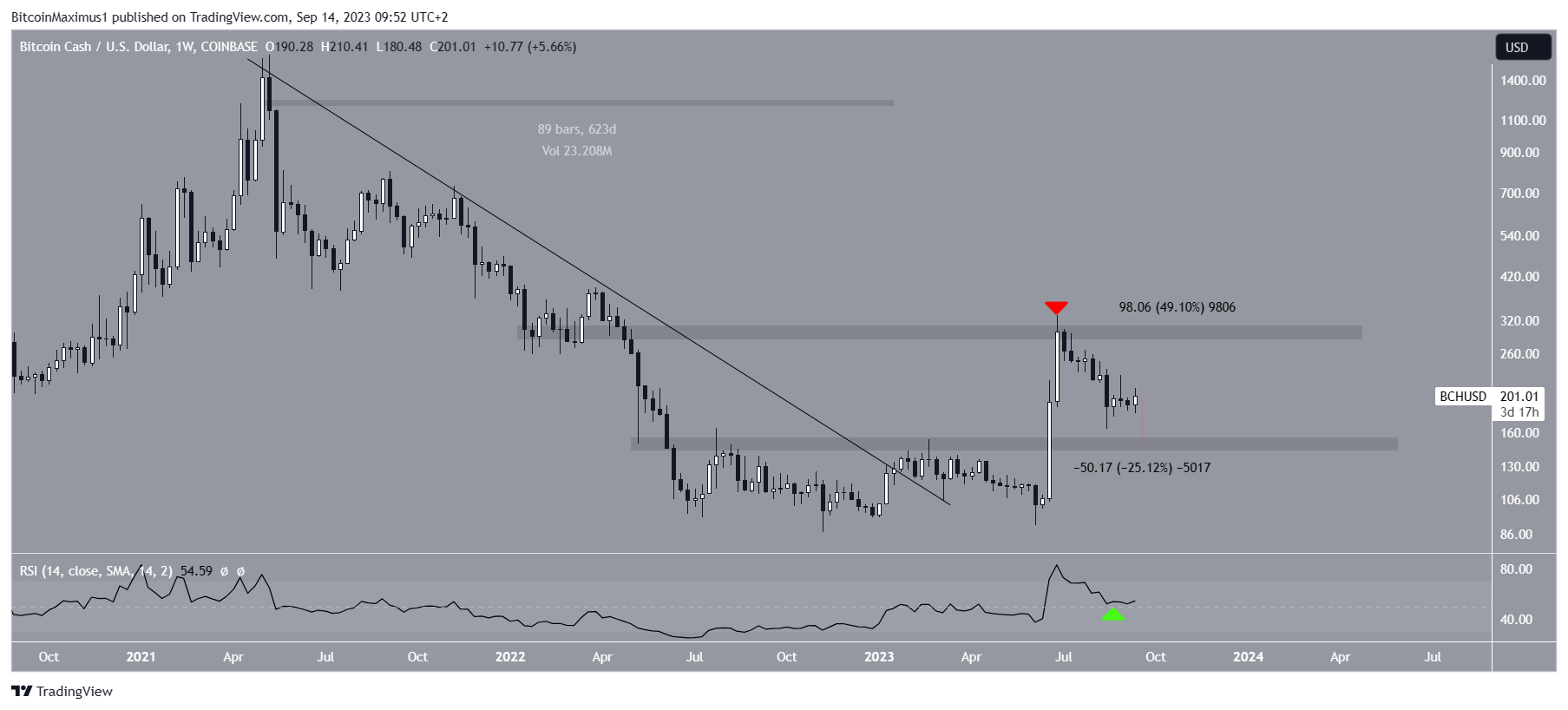 A análise semanal do BCH mostra que, em janeiro, o preço superou uma linha de tendência de baixa que estava em vigor há 623 dias. No entanto, o token lutou para seguir em alta após este rompimento.