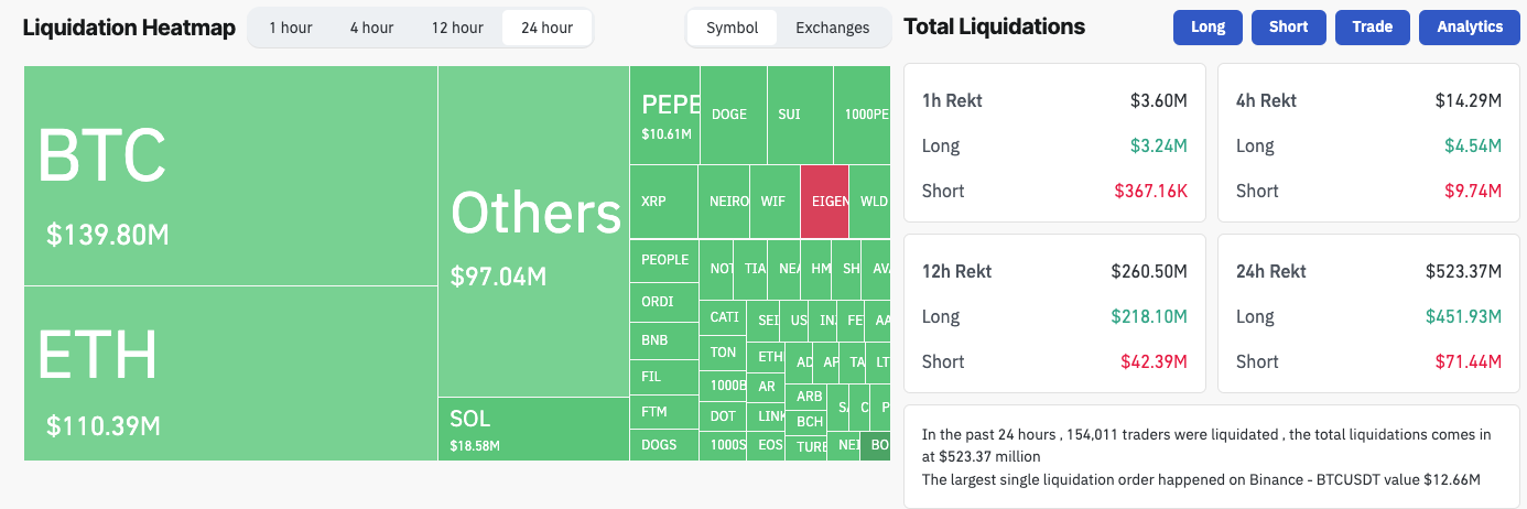 À medida que as tensões aumentam, o mercado cripto sofre repercussões imediatas. O valor do Bitcoin despencou para pouco abaixo de US$ 60.200, marcando uma queda acentuada de 6% em relação ao seu pico anterior de cerca de US$ 64 mil. Consequentemente, o mercado testemunhou liquidações extensivas, com a Coinglass relatando que as liquidações nas últimas 24 horas somaram impressionantes US$ 523,37 milhões.