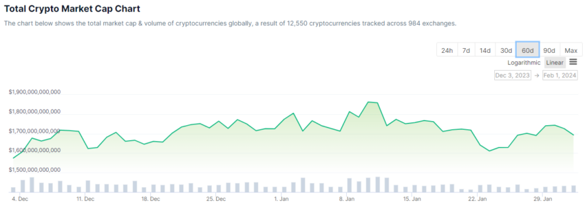 O mercado de criptomoedas subiu 2,3% nas últimas 24 horas, à medida que a capitalização total atinge US$ 1,73 trilhão. No entanto, permanece dentro de um canal lateral que se formou ao longo dos últimos dois meses.