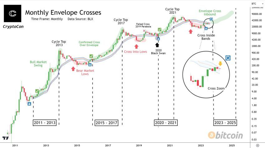 A quarta previsão do Bitcoin é baseada nos sinais dos indicadores. Sua lógica é baseada em encontrar o momento em que a criptomoeda rompe a média móvel superior. Esse comportamento, segundo as observações do autor, é um prenúncio do início de um ciclo altista. A julgar pela programação, estamos próximos deste acontecimento.