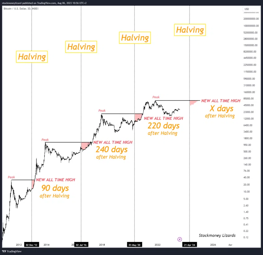 O autor da primeira previsão tentou prever quanto custará o Bitcoin na época do halving de 2024. Para isso, ele tomou como base a observação de que o ativo, aproximadamente 220 dias após o evento, atinge um novo preço recorde.
