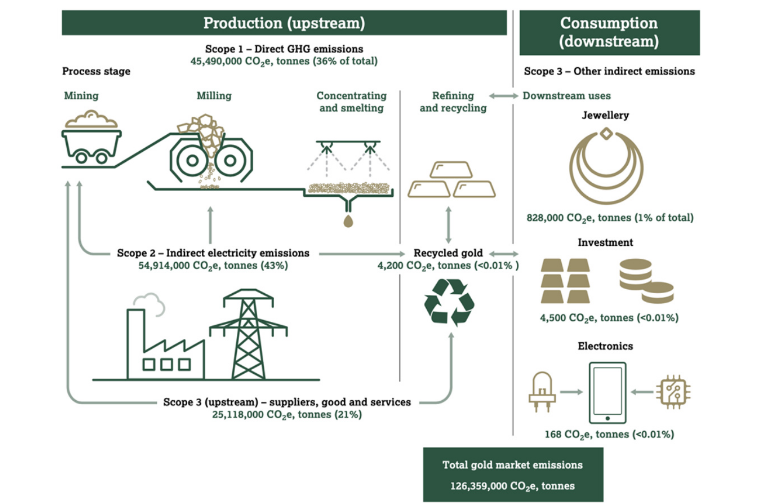 Os analistas estudaram todos os processos envolvidos na indústria do ouro, o que inclui a emissão direta e indireta de gases do efeito estufa, além daquelas feitas por processos de refino e reciclagem. Seu consumo estimado, calculado pela multiplicação de 100.408.508 toneladas de CO2 de emissões com o multiplicador de intensidade de carbono global IEA, é de 24,61 TWh/ano.