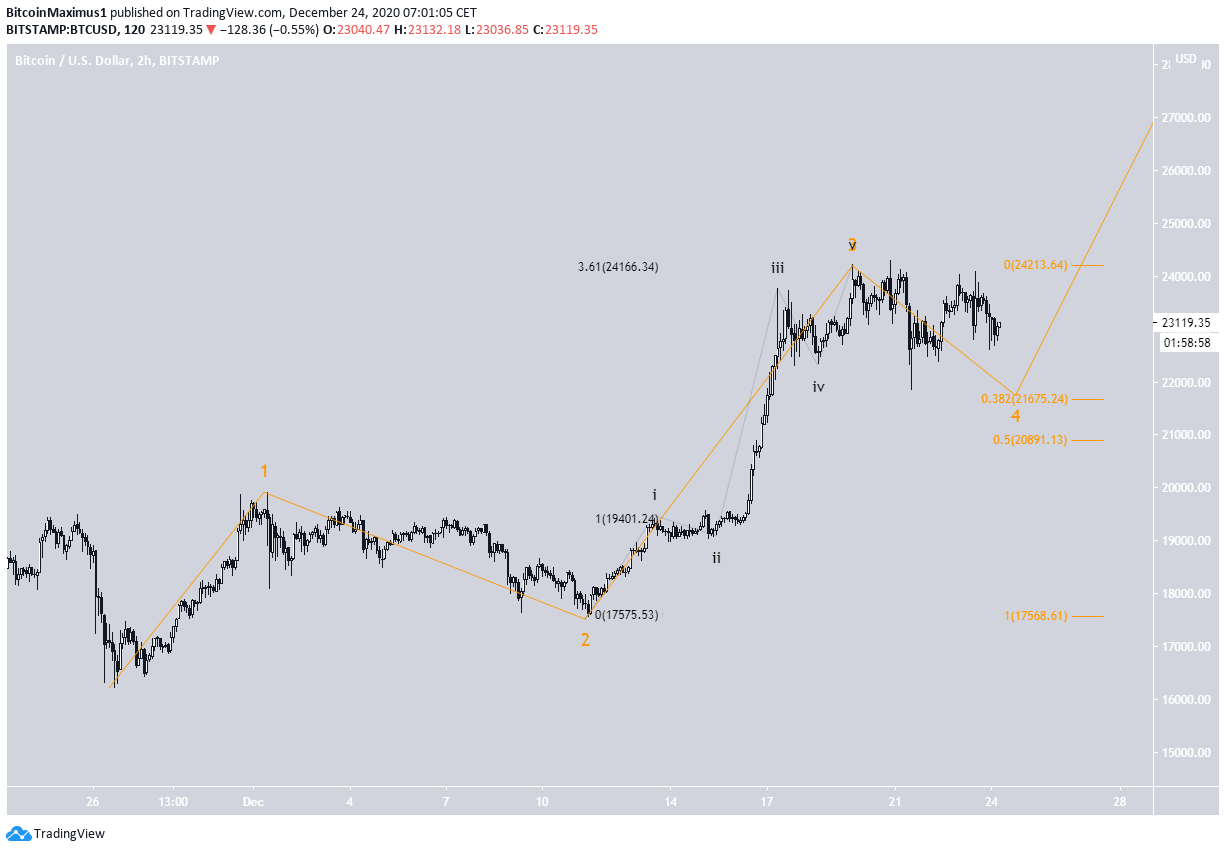 A contagem de ondas mais provável sugere que o BTC está na onda 4, que deve terminar perto de $ 21.675 (nível de retração de Fibo de 0,382).