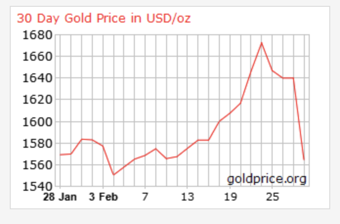 O ouro foi negociado por US $ 1.682 a onça em 24 de fevereiro, de acordo com o Bullion Vault. No entanto, caiu desde então para US $ 1.585 por onça. Embora essa queda não seja drástica para os mercados de criptomoedas, é uma queda significativa para o metal precioso estável. Quando colocado no gráfico mensal, a queda parece significativa.