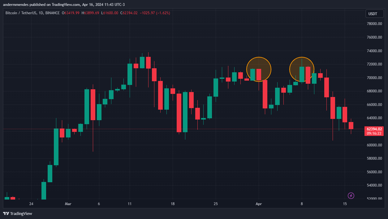SponsoredEssa tendência tem sido observada desde o dia 8 de abril, quando o Bitcoin formou um padrão de topo duplo (círculos laranja).