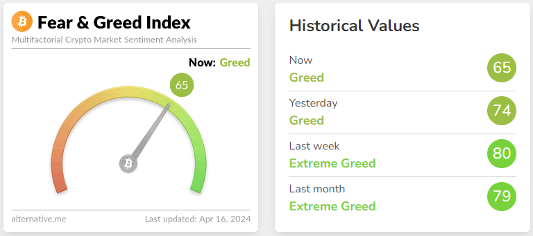 O Crypto Fear & Greed Index, que mede o sentimento geral do mercado, mostra que os investidores estão propensos a este cenário. Atualmente, o indicador está em 65, mostrando que o sentimento geral segue sendo de ganância, mesmo com as quedas recentes do BTC.