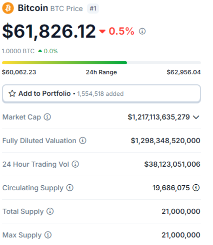 O Bitcoin segue em tendência de baixa. Somente nos últimos sete dias, seu preço caiu 12%, ficando abaixo da marca de US$ 62.000.
