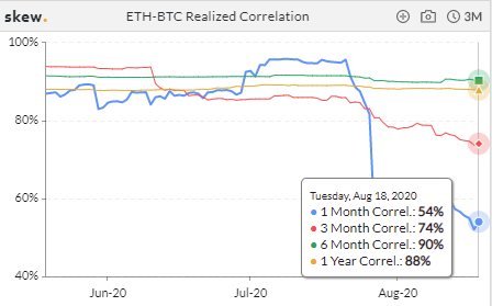 Não coincidentemente, o nível de correlação real entre os preços também está baixo. Ainda de acordo com a Skew, a métrica que considera os preços dos últimos três meses está em 58%, bem abaixo dos 90% do número referente a seis meses.