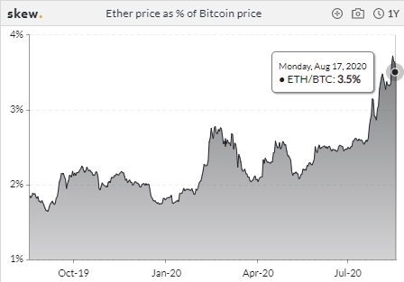 Essa diferença tem, em grande parte, favorecido o investidor de Ethereum. Desde maio, o ETH vem se valorizando fortemente em relação ao Bitcoin. O valor de 1 ETH passou de 2,1% para 3,5% de 1 BTC em três mses.