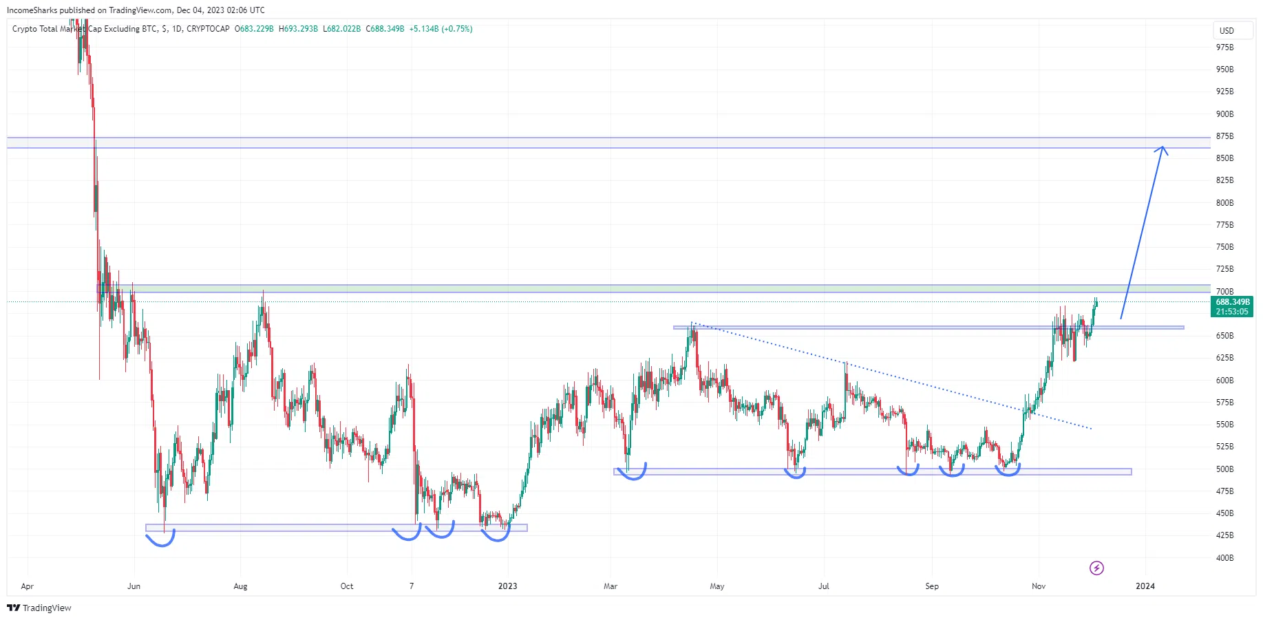 No entanto, as altcoins ficaram atrás do Bitcoin nos ciclos anteriores, então a história provavelmente está se repetindo. Os analistas estão de olho nas altcoins em antecipação a esse movimento. Nesta segunda-feira, “IncomeSharks” comentou: