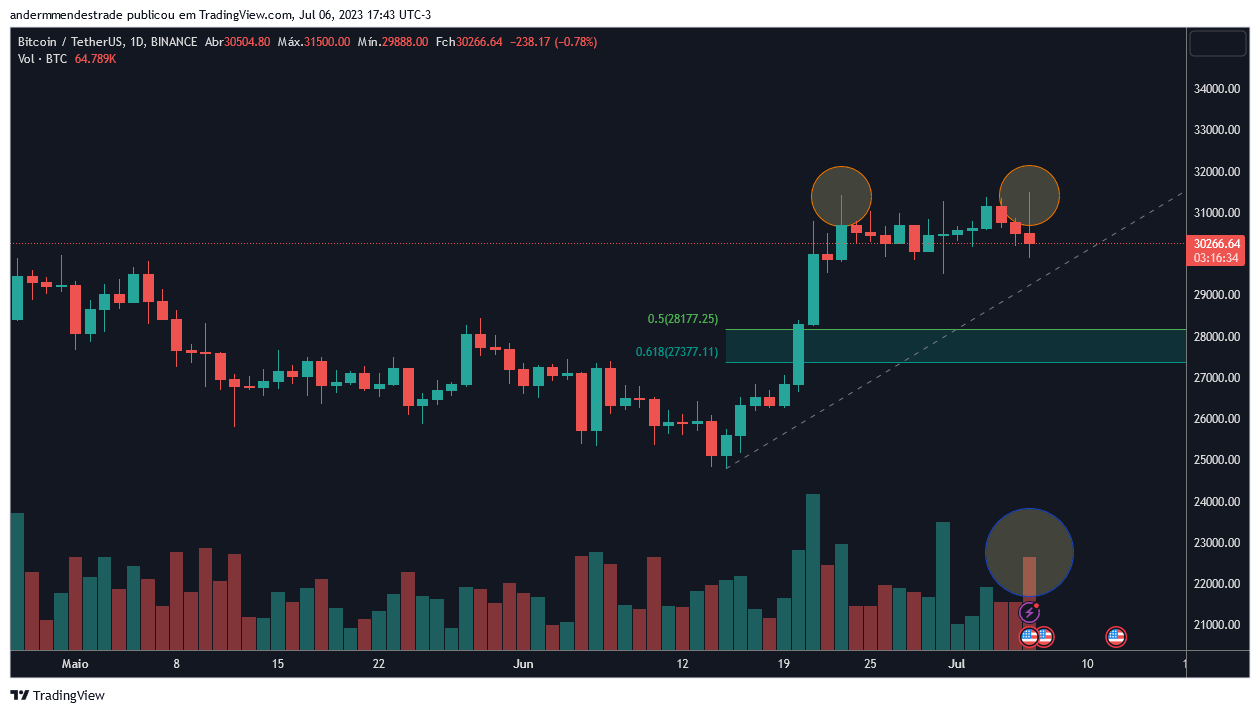 Por fim, vale destacar que o volume de negociações visto nas últimas 24 horas (círculo azul) foi o maior registrado em julho. Ou seja, compradores (touros) e vendedores (ursos) estão travando uma verdadeira batalha pelo controle da tendência atual. O fato de nenhum grupo estar conseguindo tomar a dianteira explica a tendência atual ser lateralizada.