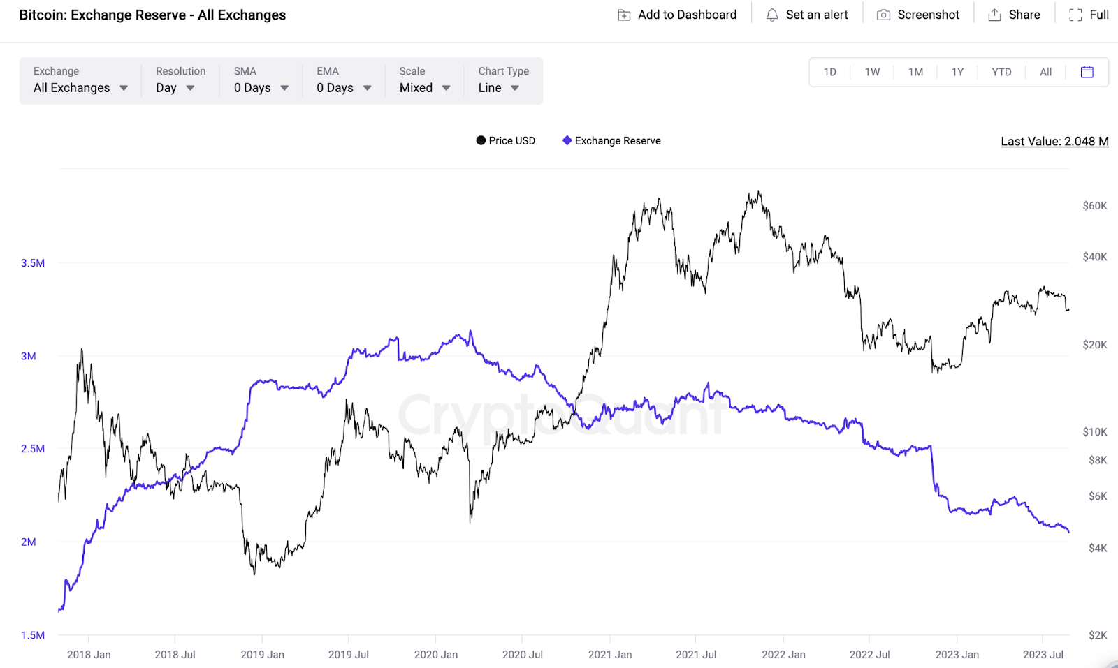 O Bitcoin depositado em carteiras de exchanges caiu para o nível mais baixo em 5 anos, de acordo com dados on-chain compilados pela Cryptoquant. O gráfico abaixo mostra que as reservas cambiais de Bitcoin caíram para 2,05 milhões de BTC em 24 de agosto.