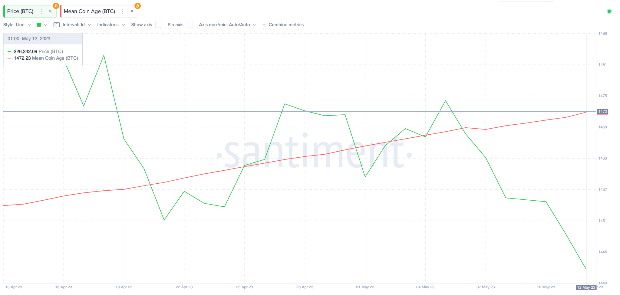 Atualmente, o BTC Mean Coin Age permaneceu sólido esta semana, apesar da maior incerteza em torno do teto da dívida e dos mercados monetários dos EUA.