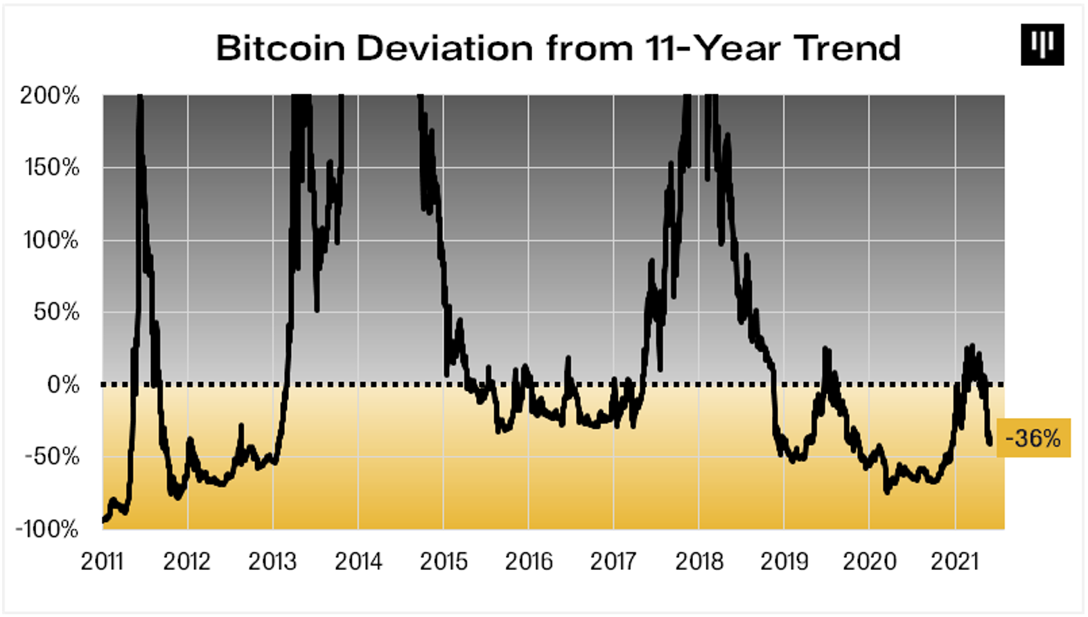 Além disso, o Bitcoin está se desviando de sua linha de tendência de alta de 11 anos. O desvio chega a ser de 36% negativo. Isso dá um sinal adicional de que o valor da criptomoeda está subvalorizado, e também mostra que existe espaço para alta. Os picos dos mercados altistas anteriores levaram a criptomoeda bem acima desta linha de tendência.