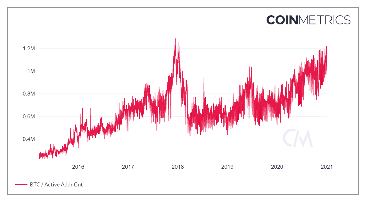 SponsoredConforme o gráfico da CoinMetrics de endereços ativos, o bitcoin está em índices parecidos com os registrados em 2017. No entanto, a quantidade de novos endereços está atualmente numa subida mais consistente do que foi o pico momentâneo do último rally.