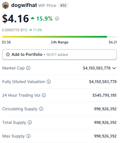 De maneira geral, a Dogwifhat ocupa atualmente a primeira posição entre as criptomoedas que mais subiram no dia após o seu preço saltar quase 16%.