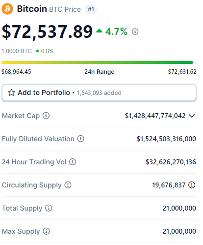 O Bitcoin voltou a realizar um forte salto de preços nesta segunda-feira (8), superando com força a barreira dos US$ 72.000. Com isso, ele conseguiu eliminar as perdas da semana passada.